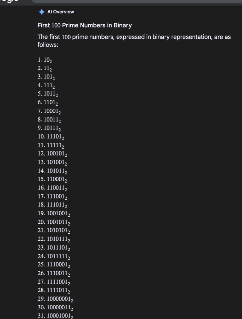 Asked Google-AI “What are the first 100 prime numbers, in binary notation.” This was the reply:
